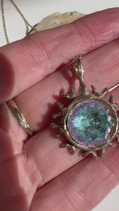 Our Corona pendants are available in solid 14k or 10k yellow gold, Sterling Silver or Bronze with a sparkling Czech Glass center stone. You can choose to purchase the pendant on its own, or with an adjustable chain in either bronze (16 or 17 inches), sterling silver (16 or 17 inches), or solid 10k or 14k yellow gold (16 or 17 inches). Simply select your preferred option, and feel free to leave a note or email us with your desired chain length.