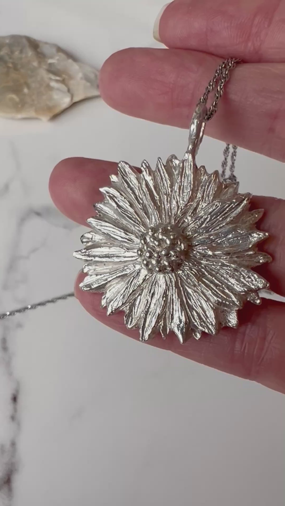 Our Soleil flower pendants are available in solid 14k or10k yellow gold, bronze or sterling silver. You can choose to purchase the pendant on its own, or with an adjustable chain in either sterling silver or bronze (16 or 17 inches) or solid 10k or 14k yellow gold (16 or 17 inches). Simply select your preferred option, and feel free to leave a note or email us with your desired chain length.